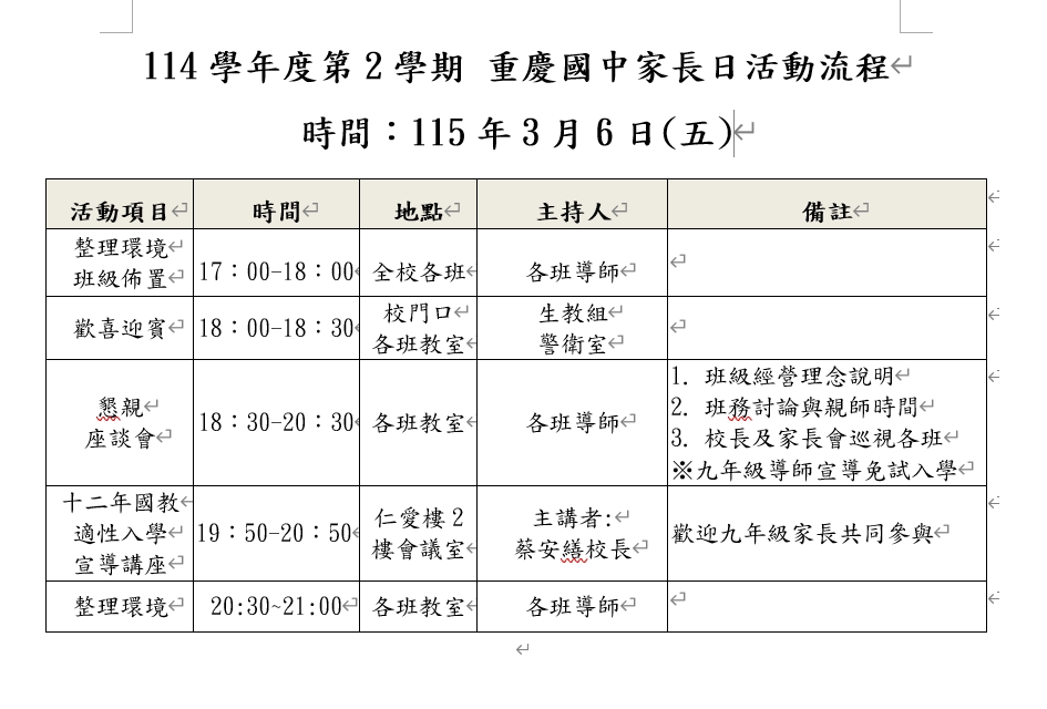 本校114學年度第2學期家長日時間訂於115年3月6日(五)18:00-21:00,敬邀各位家長參與~